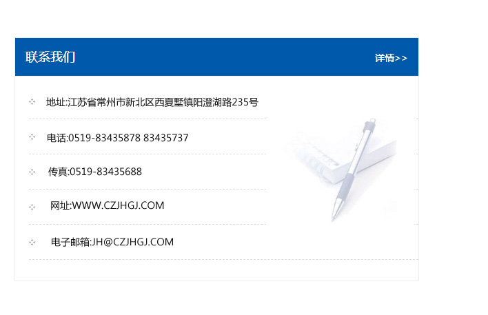地址:常州市新北區(qū)友邦商務(wù)大廈1幢16、17層  電話:0519-85101652  傳真:0519-85112595  郵編:213022  網(wǎng)址:www_cz-jiayue_cn.shjhyq.com  郵箱:xiajifengaa@163.com